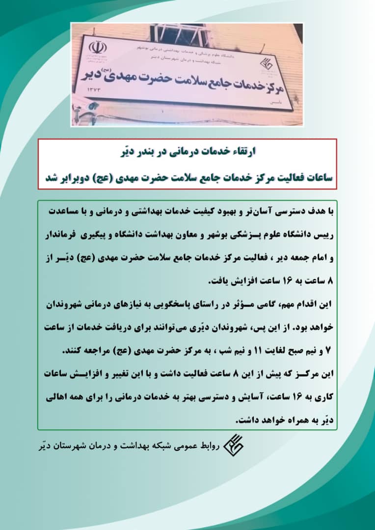 با هدف تسهیل دسترسی شهروندان به خدمات بهداشتی و درمانی و در راستای ارتقای کیفیت ارائه خدمات در شهرستان دیّر، ساعت کاری مرکز خدمات جامع سلامت حضرت مهدی(عج) از ۸ ساعت به ۱۶ ساعت افزایش یافت.